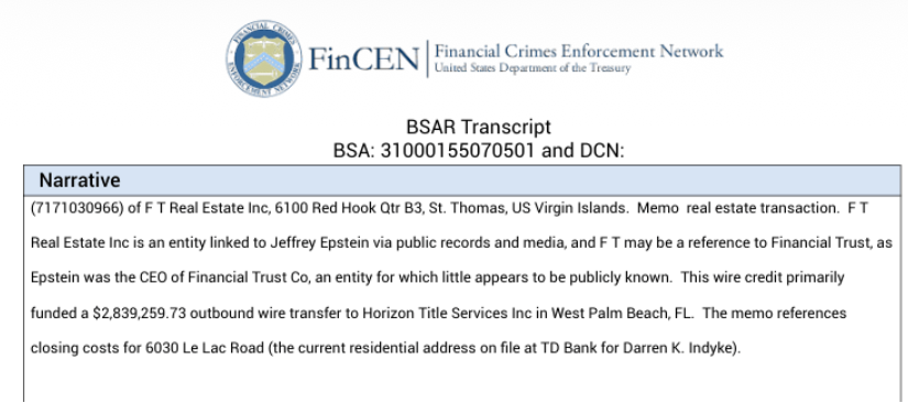 “[Indyke’s] account was credited by a suspicious $3,000,000 wire transfer from the FirstBank Puerto Rico account of F T Real Estate Inc,” the SAR states. “The memo references closing costs for 6030 Le Lac Road (the current residential address on file at TD Bank for Darren K. Indyke).”